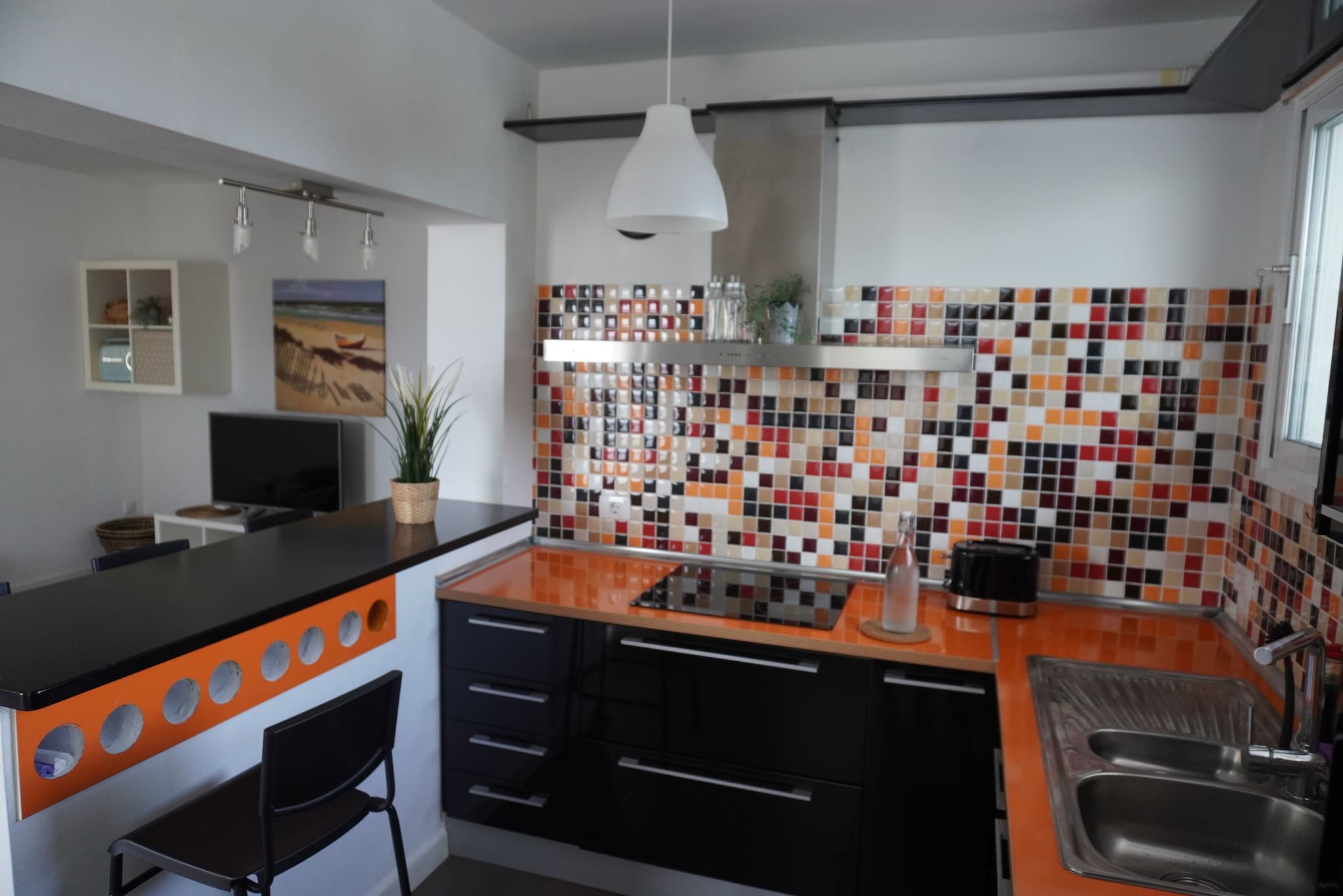 Una vez que acceda a la vivienda, encontrará un coqueto recibidor por el que accederemos al salón que comunica con la cocina a través de una barra americana. Ambas estancias están decoradas con mucho encanto y cuentan con amplias ventanas que proporcionan mucha luz a la vivienda. Detrás de este ventanal, una pequeña y acogedora terraza con vistas al mar.